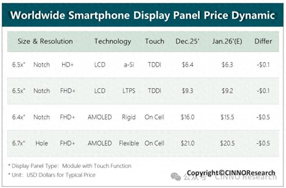 智通财经APP获悉,CINNO Research发文称,进入2026年1月,手机面板市场正式步入传统淡季,叠加上游存储器价格连续数月上涨,终端品牌为缓解成本压力牛掌柜,纷纷主动缩减出货目标以控制经营风险牛掌柜,由此导致手机面板整体需求明显走弱。在终端拉货动能不足的背景下,上游面板厂稼动率普遍承压,价格下行压力进一步加剧。